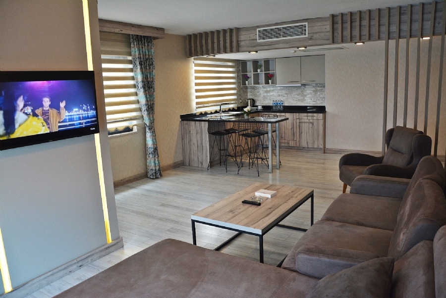 The 3+1 Suite is one of the hotel's largest and most luxurious room types. It features three separate bedrooms and a spacious living area. Designed for large families or groups of friends, it's also quite comfortable for extended stays, thanks to its modern decor, spacious interior, and amenities reminiscent of home comforts. The rooms feature amenities such as a TV, minibar, air conditioning, private bathroom, hairdryer, seating area, kitchenette, and With sea View Balcony