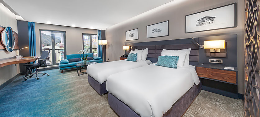 Deluxe Rooms offer a more spacious living area than standard rooms and are modern and comfortable. With their stylish decor and high-quality furnishings, they provide an ideal environment for both relaxation and work. Room amenities include air conditioning, free Wi-Fi, a flat-screen TV, minibar, work desk, wardrobe, tea and coffee making facilities, a private bathroom, and complimentary toiletries.
